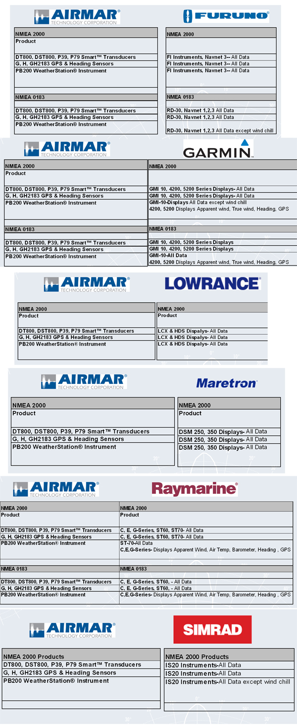 AirMar公司W(wǎng)X系列超聲波氣象儀,具有NMEA0183或者NMEA2000數(shù)據(jù)格式輸出,下列廠家生產(chǎn)的顯示設(shè)備可以與PB150或PB200連接,顯示氣象數(shù)據(jù)。